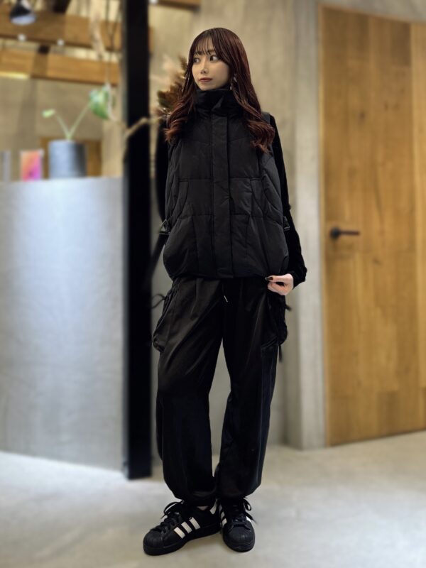 ダウンベストはスポーティな雰囲気があり、スウェットやワイドパンツに合わせたりして