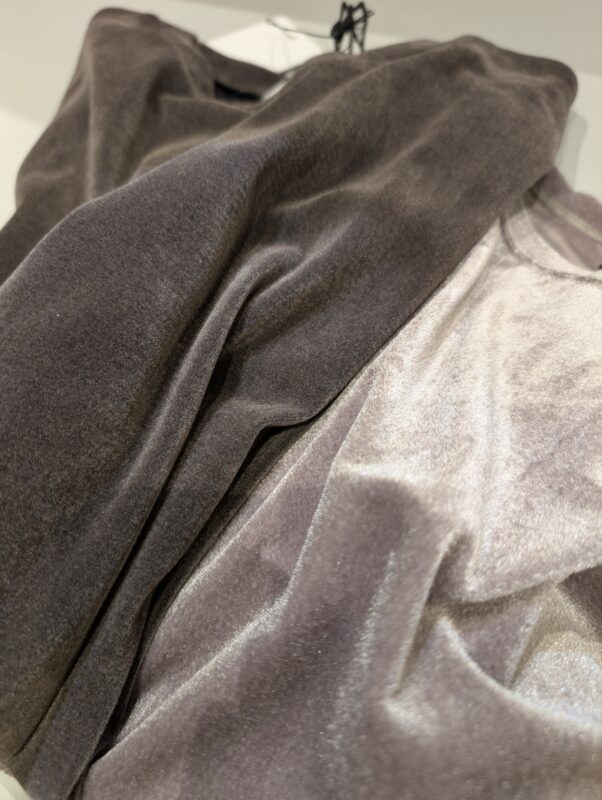 今回は、そんな気分にぴったりの「ベロア×シアー」素材のトップスを2点ご紹介します。