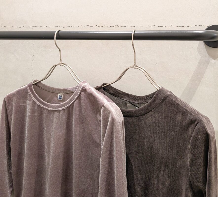 今回は、そんな気分にぴったりの「ベロア×シアー」素材のトップスを2点ご紹介します。