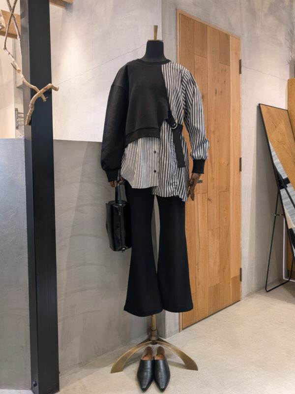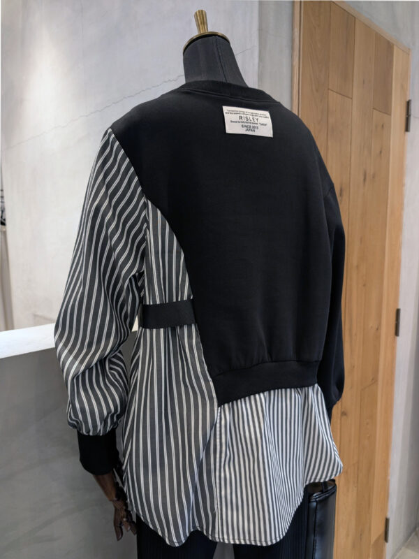 スウェットとシャツをドッキングした、遊び心のあるデザイン。
