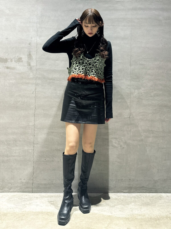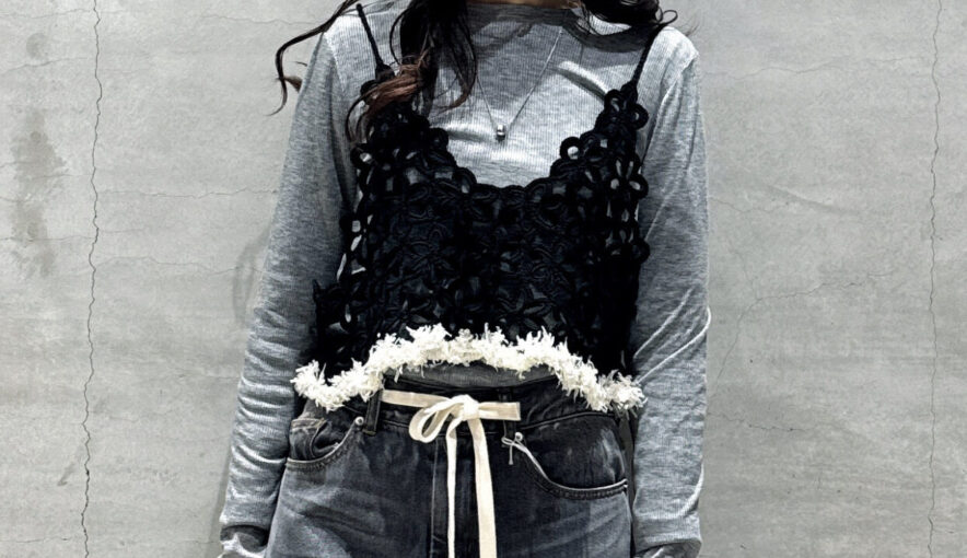 今回のビスチェは立体感のある編み柄が特徴で、無地トップスに合わせても存在感がしっかり出ます🙆♀️