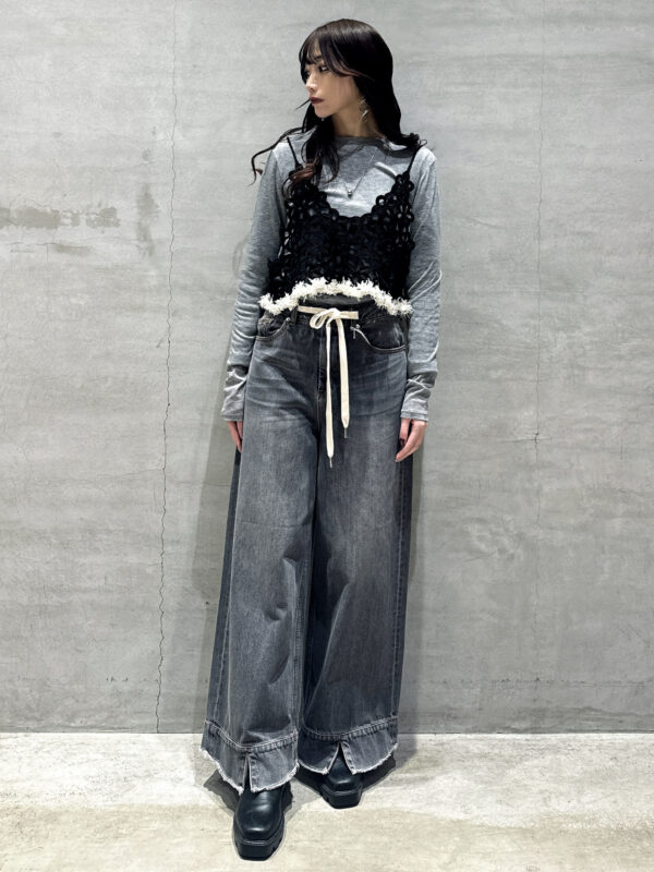 モノトーンコーデに合わせるとビスチェの編み柄が引き立ち、シンプルながらも個性がある仕上がりにできます。