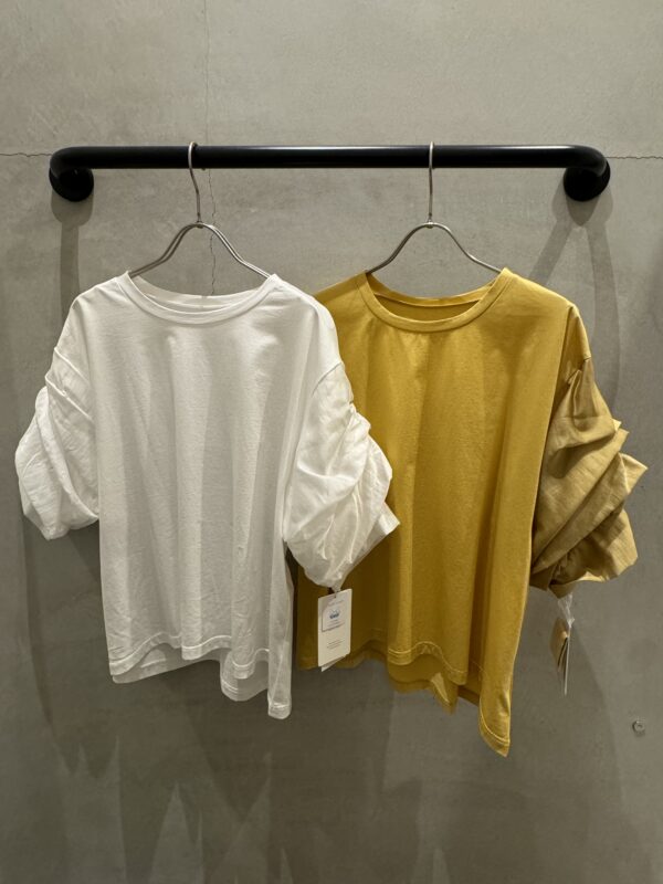 身幅はすっきりとしたカットソー素材で着やすく仕上げつつ、袖部分だけ異素材で切り替えられた