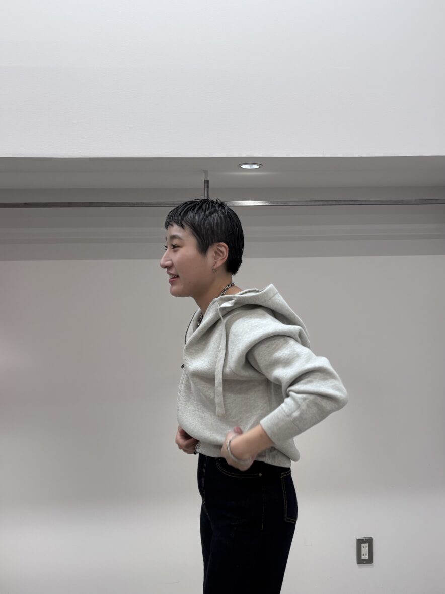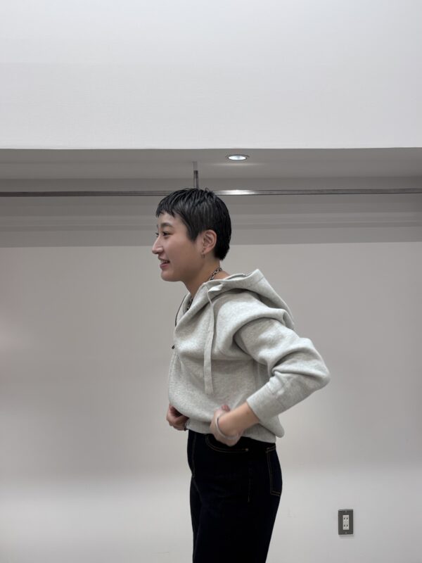 裾リブが長く、ウエストに乗せて着ても◎。