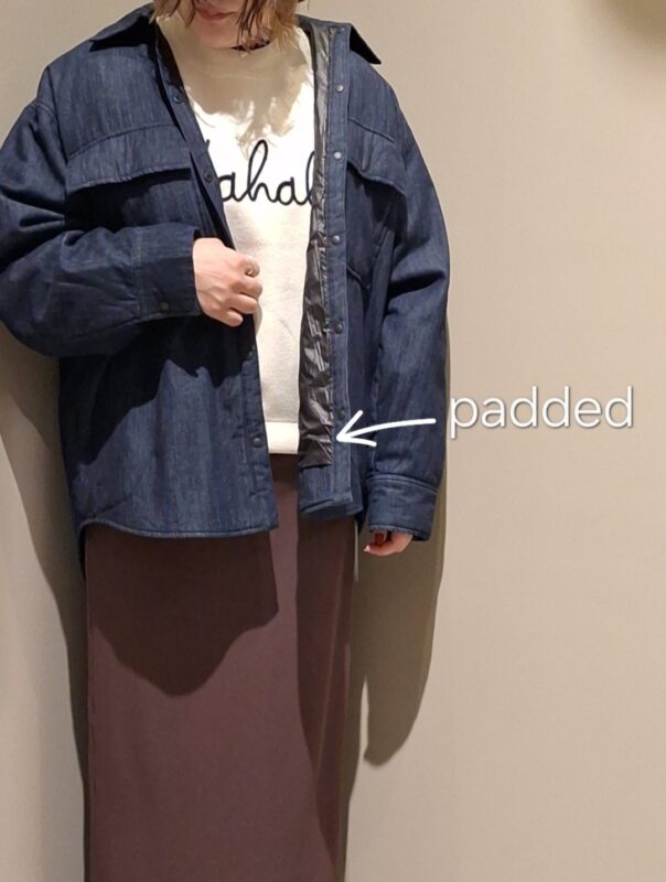 このデニムジャケットは内側が中綿仕様になっていて見た目はデニムシャツのようですが、とっても暖かいのがポイントです👏