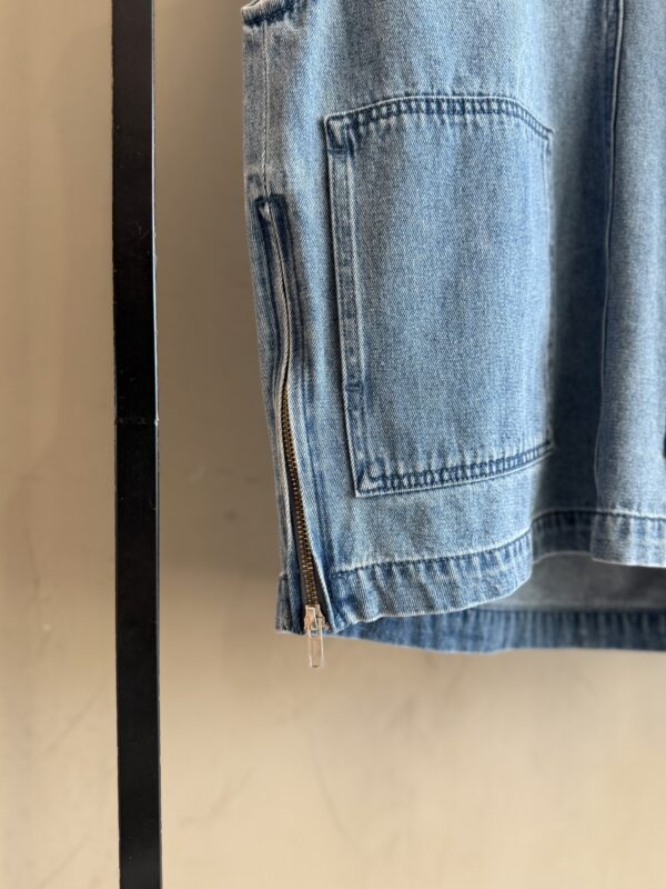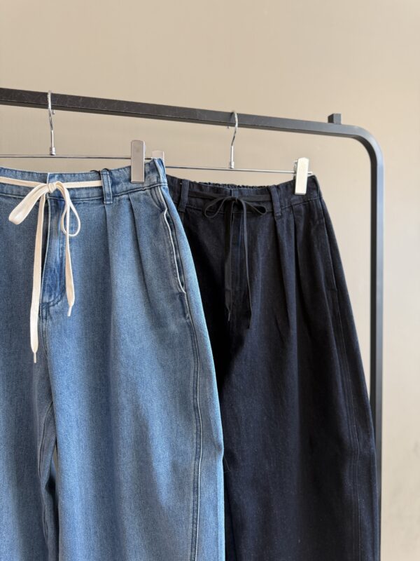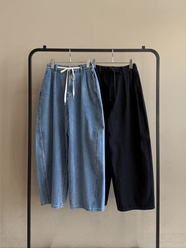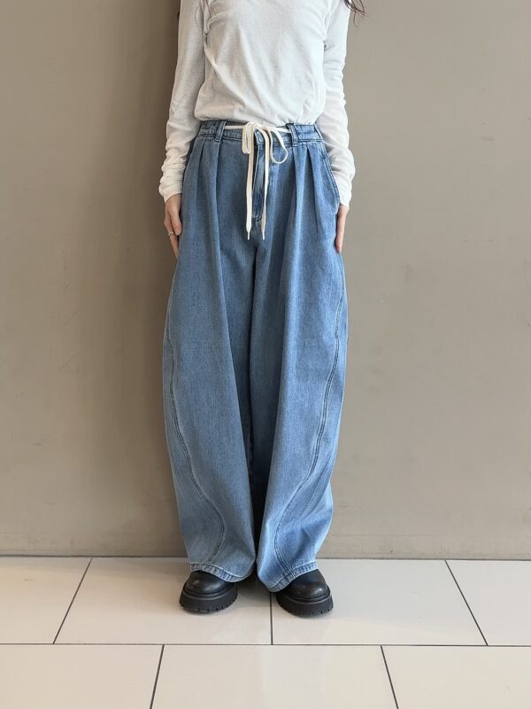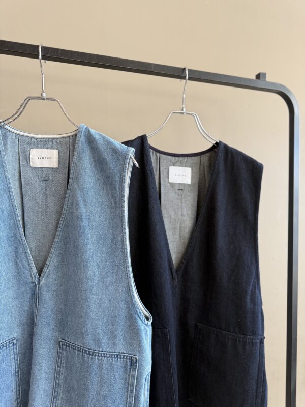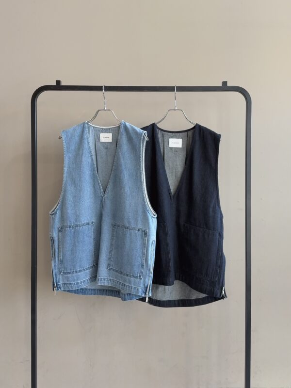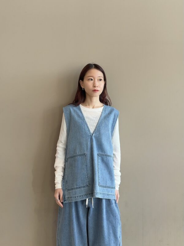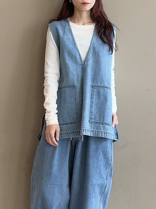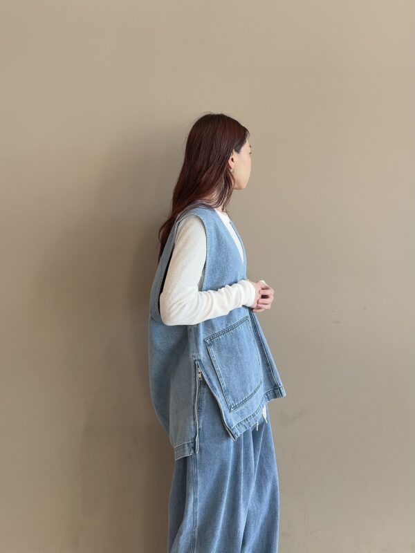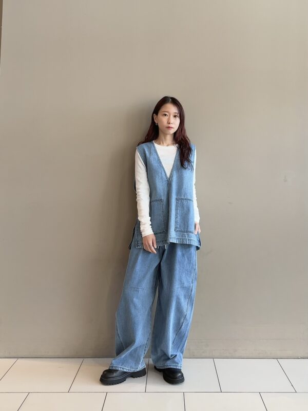 トップスはデニムのサイドジップベスト。パンツはカーブシルエット。