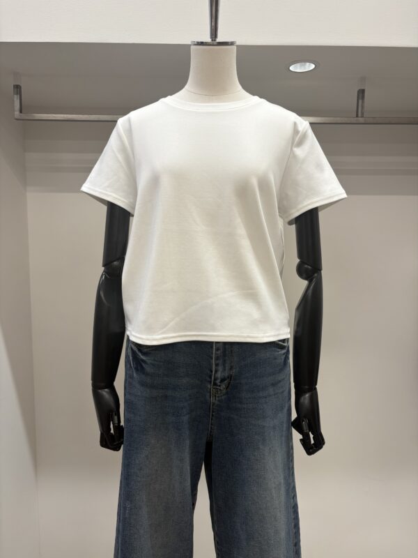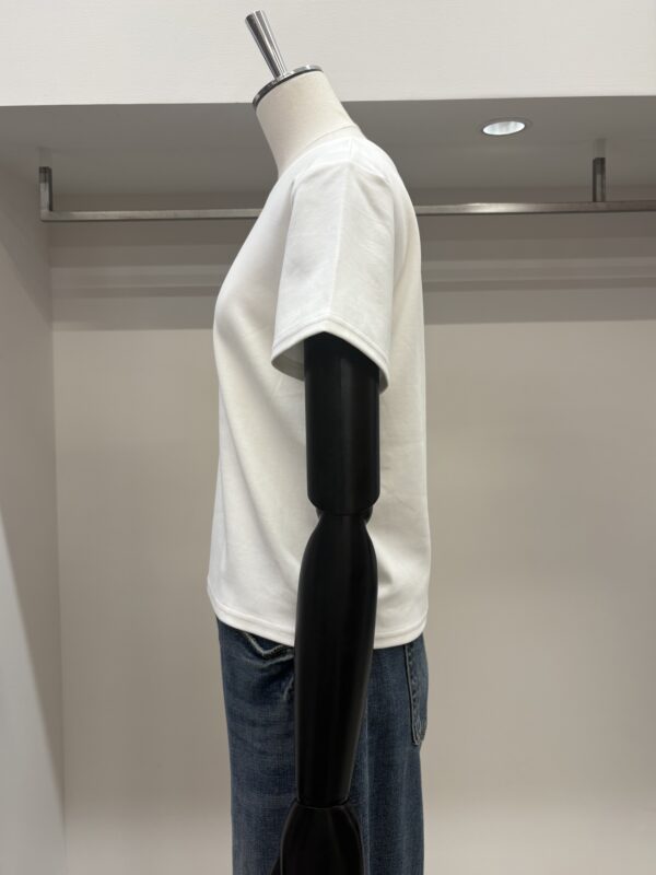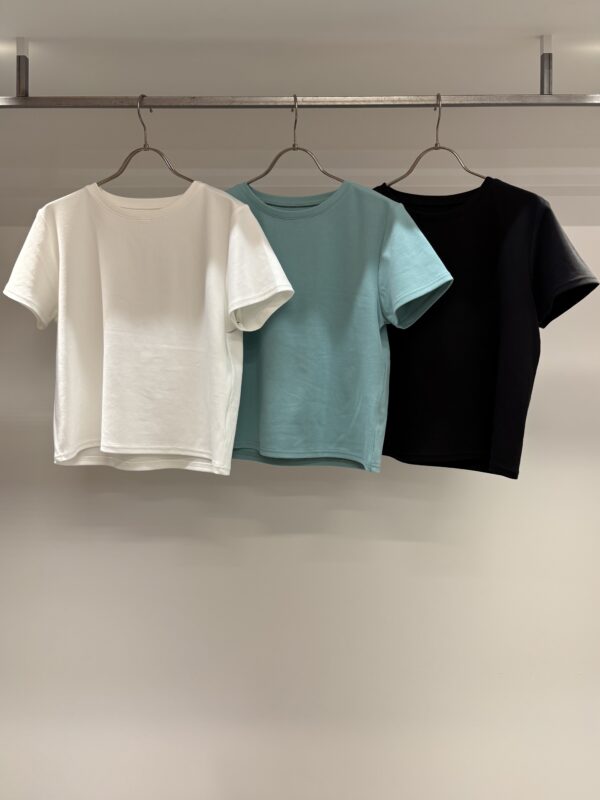 定番人気の短丈、コンパクトなTシャツ。シンプルで着回ししやすく、ビスチェやベストなどのレイヤーどもしやすいです。コットンにポリウレタンが入っているので伸縮性があり、しわになりにくいのも嬉しい。