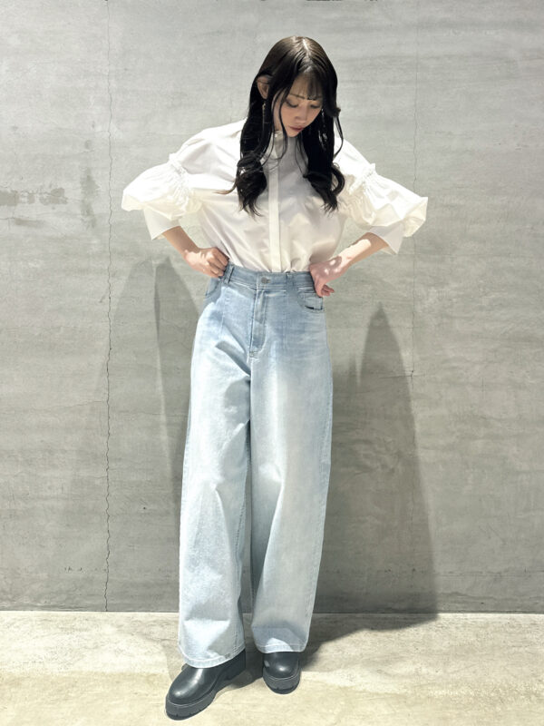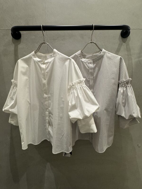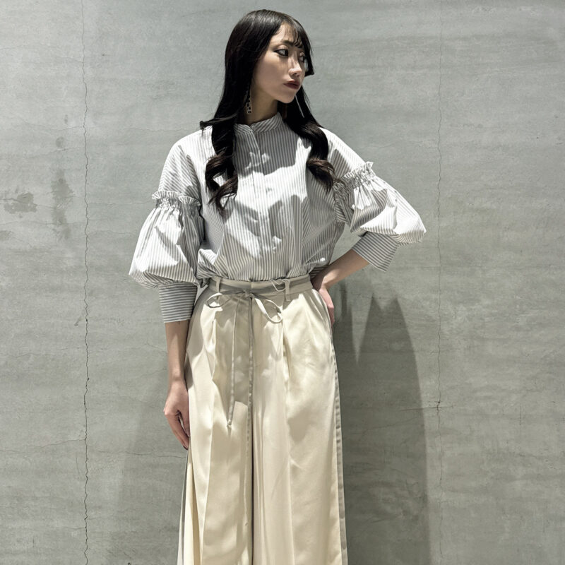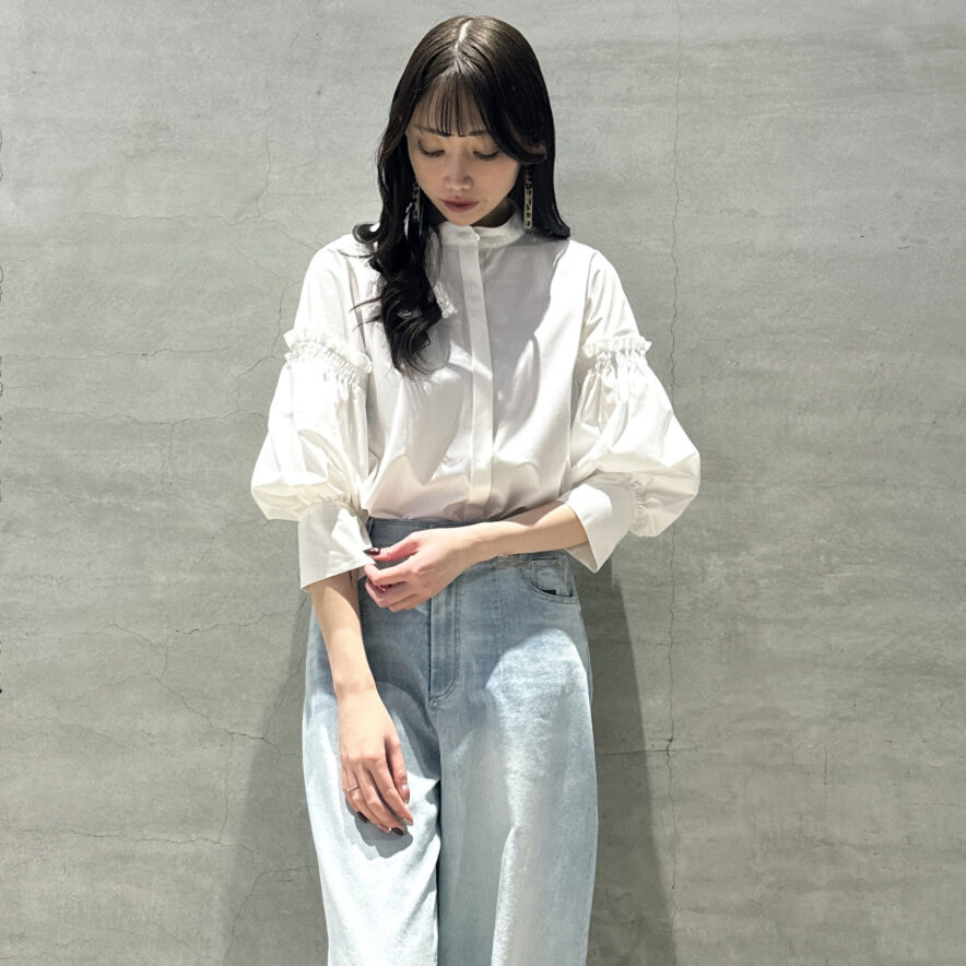 袖にたっぷりとボリュームを持たせたブラウスで、着るだけでコーデの軸となる一枚です。